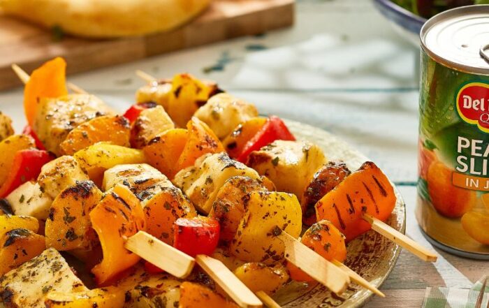 Halloumi, Peach and Pepper Skewers with Mint Dressing